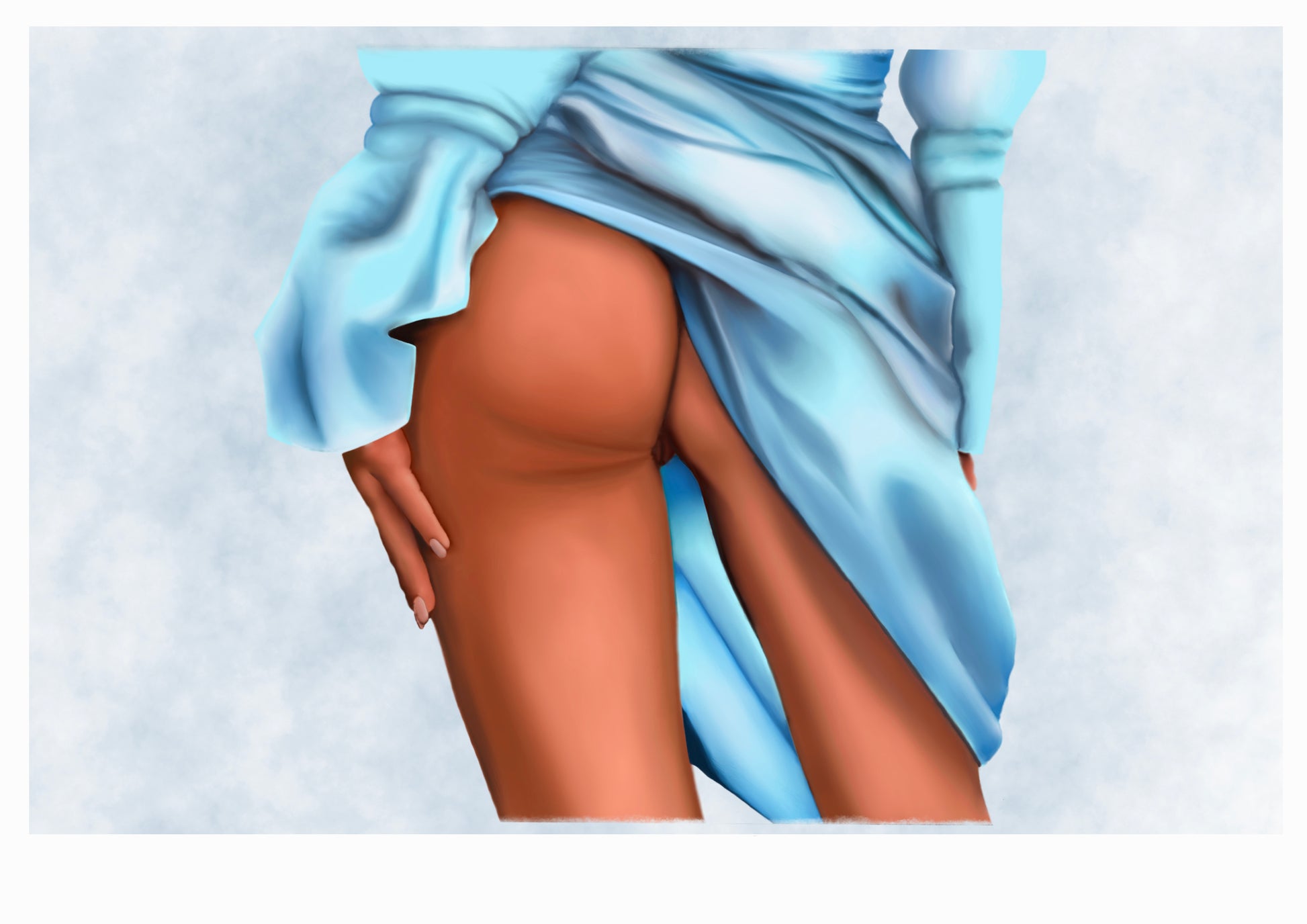 Blue Silk Secret is a playful meeting of elegance and allure. The smooth drape of lustrous blue silk falls in soft folds, revealing just enough to spark curiosity. Warm skin tones contrast against the cool fabric, while the subtle gesture of the hand adds a note of coy confidence — a secret shared only with the viewer.