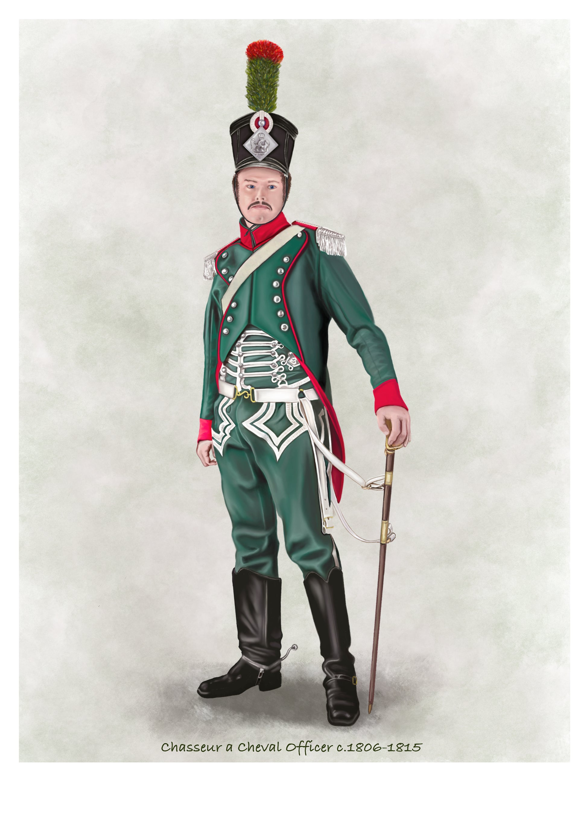 This finely detailed artwork depicts a Chasseur à Cheval Officer of the French Imperial Guard, c.1806–1815, during the Napoleonic Wars. The officer is shown in full dress uniform: the distinctive green coat with red facings, silver epaulettes, and ornate braiding across the chest, paired with tall black boots and the traditional shako crowned with a red and green plume. His poised stance with sword in hand reflects both the elegance and authority of Napoleon’s light cavalry.