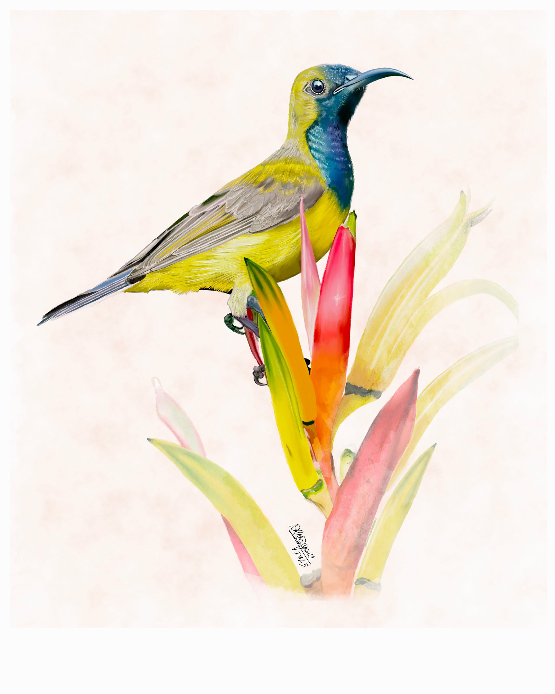 Native to Southeast Asia and northern Australia, this small nectar-feeder thrives in gardens, coastal mangroves, and flowering forests, where it flits from bloom to bloom, pollinating as it feeds. Its curved bill and rapid movements are perfectly adapted to its role as a messenger of life between bird and flower.