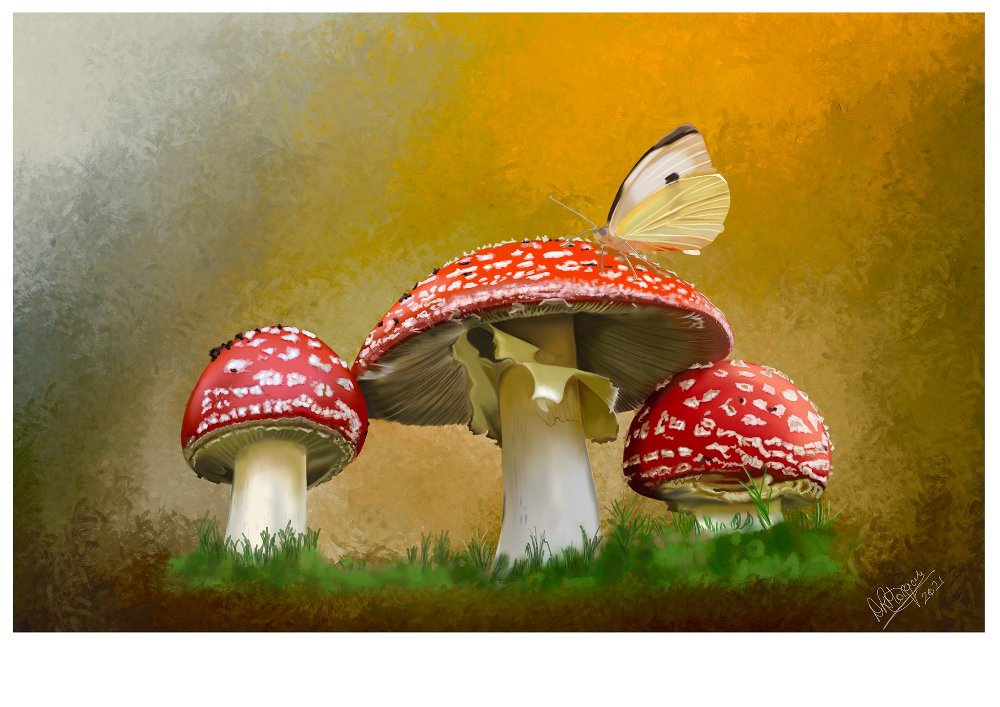 This serene artwork captures the timeless beauty of the forest floor, where a delicate butterfly perches gracefully upon the cap of a vibrant red toadstool. Surrounded by smaller mushrooms, their rich crimson crowns speckled with white, the scene glows with earthy greens and golden light, evoking the wonder of childhood walks in the woods.